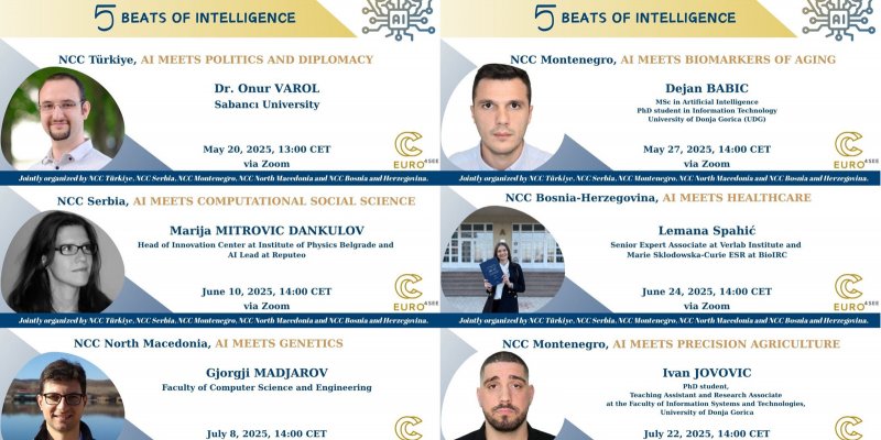 Between May and July 2025, our team partnered with colleagues from the Türkiye, Montenegro, North Macedonia, and Bosnia and Herzegovina national competence centers to organize an online seminar series called 5 Beats of Intelligence: AI Meets Diverse Domains. All the session recordings and presentations are available online. We invite everyone to view these informative recordings to learn about recent AI advancements across different sectors and to stay informed about innovative methods shared by regional specialists.