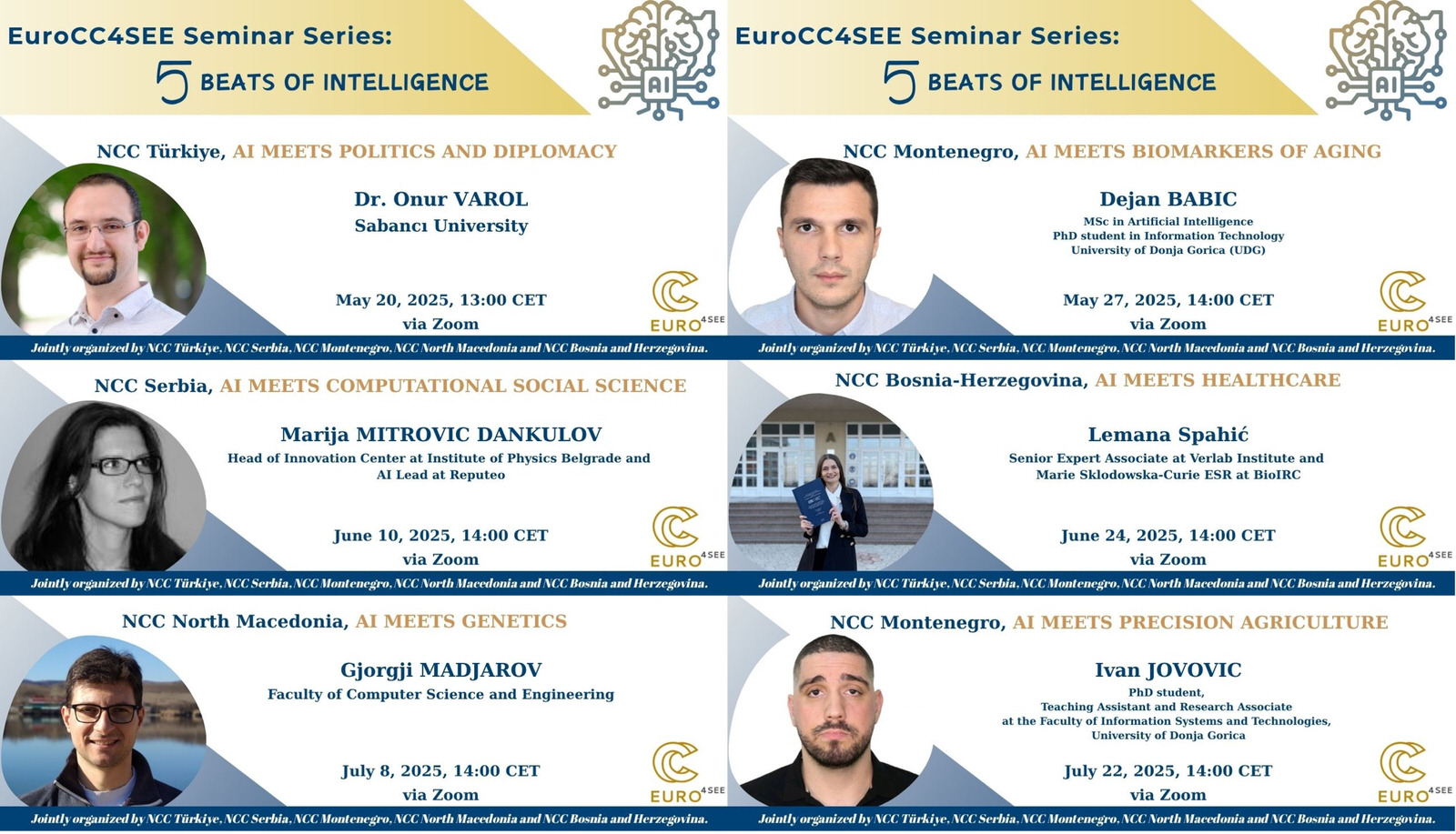 Between May and July this year, our team partnered with colleagues from the Türkiye, Montenegro, North Macedonia, and Bosnia and Herzegovina national competence centers to organize an online seminar series called 5 Beats of Intelligence: AI Meets Diverse Domains. All the session recordings and presentations are now available on the HPC Serbia website and the NCC Türkiye YouTube channel. We invite everyone to view these informative recordings to learn about recent AI advancements across different sectors and to stay informed about innovative methods shared by regional specialists.